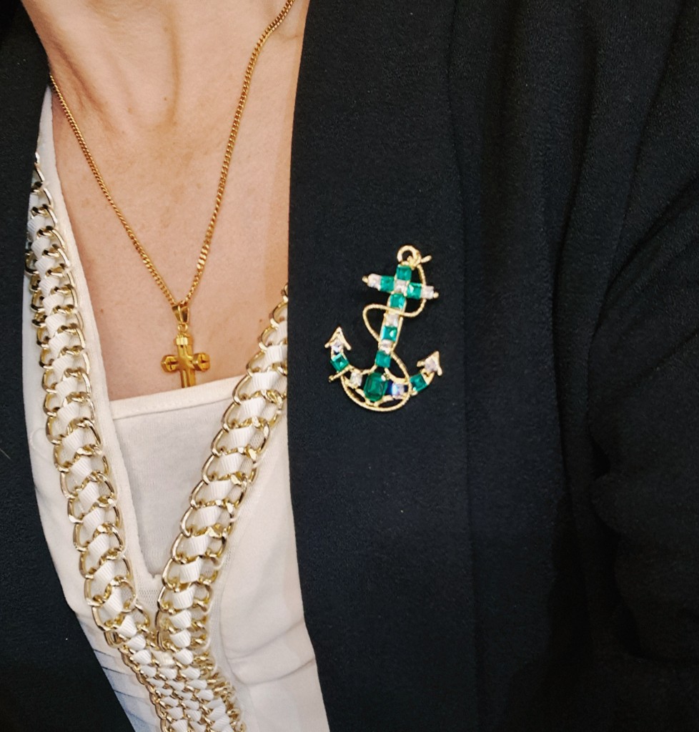 Su diseño en forma de ancla, con piedras de cristal en colores verdes y transparentes, reflejan la serenidad del mar y la luz de la esperanza.