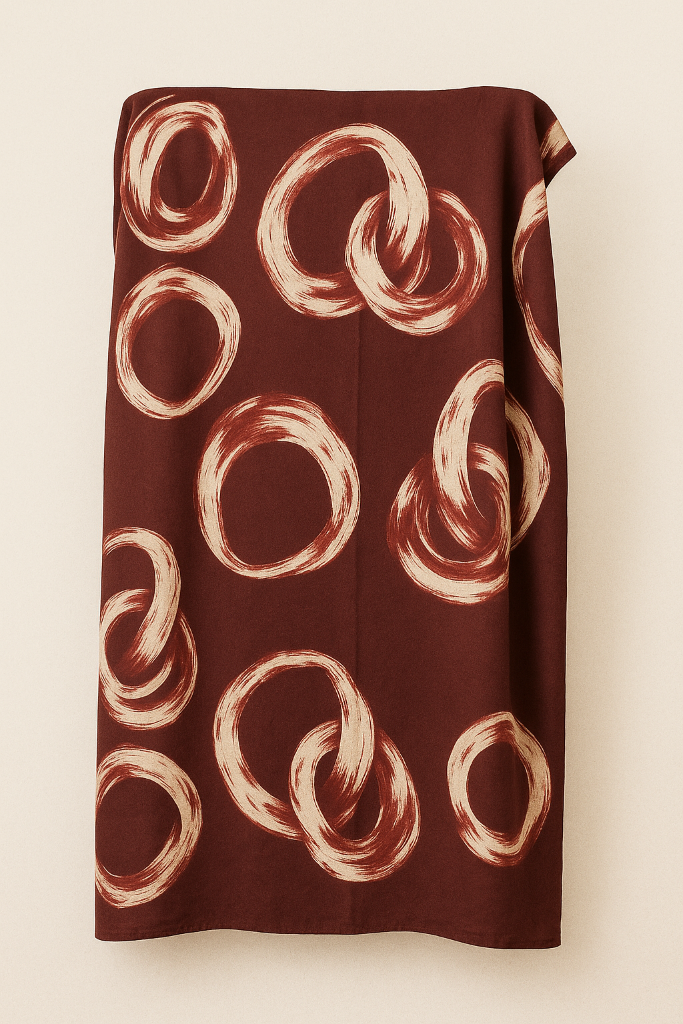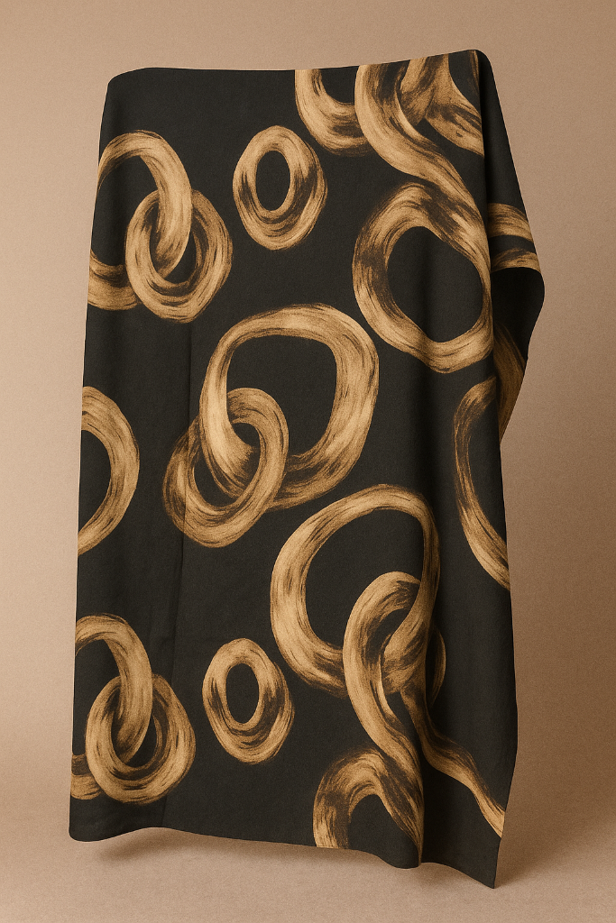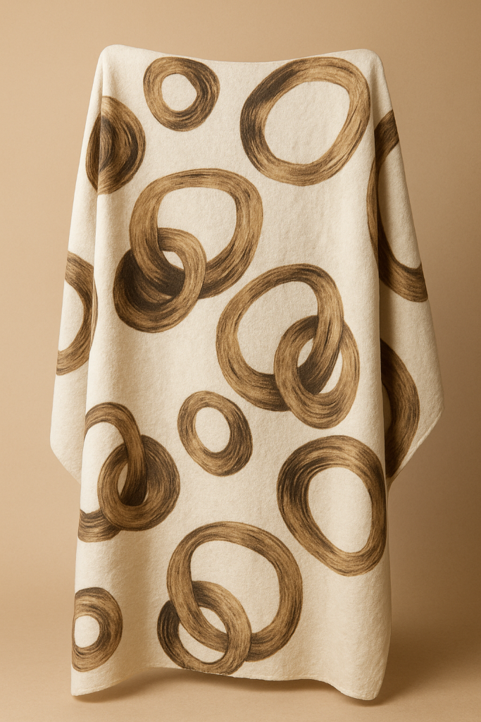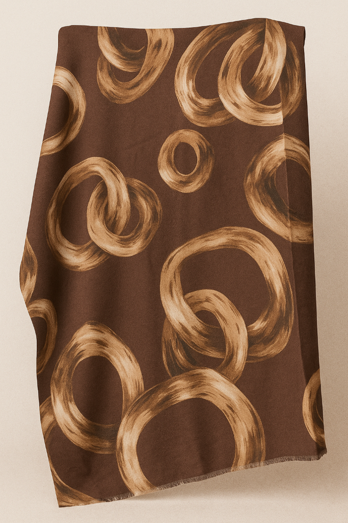 Chal de 90x200 cm confeccionado en un tejido suave y ligero con un tacto extremadamente agradable. Su caída fluida lo convierte en una pieza muy cómoda y elegante. El diseño con trazos circulares aporta un toque artísrico y moderno.